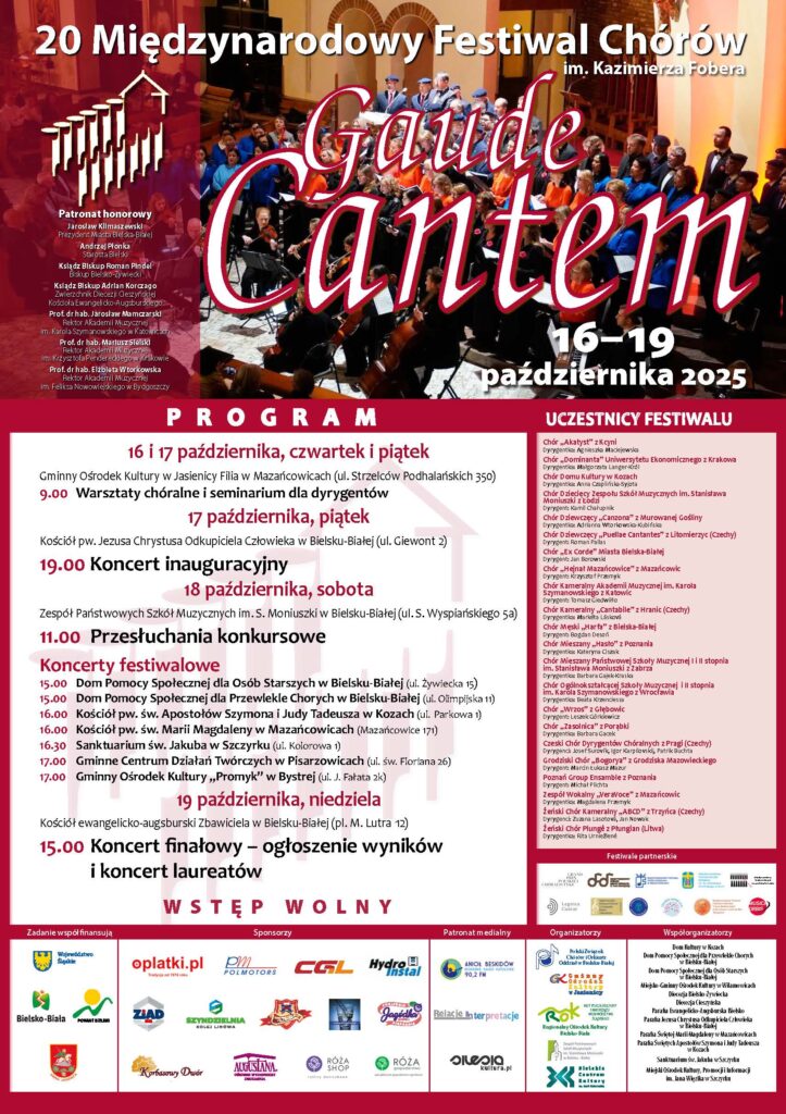 Po raz dwudziesty zapraszamy na jedyną w Bielsku-Białej i okolicznych miejscowościach imprezę chóralną „Gaude Cantem”, w której programie odnajdziemy przesłuchania konkursowe, warsztaty dla chórzystów, seminarium dla dyrygentów, a także koncerty w kościołach i obiektach świeckich. Wśród występujących są dzieci i dorośli, chóry akademickie i parafialne, absolwenci szkół muzycznych i amatorzy. A w repertuarze ogromny przekrój – od średniowiecza po Queen; utwory sakralne i biesiadne, pieśni patriotyczne i wirtuozerskie popisy współczesnych kompozytorów. Szeroka formuła imprezy umożliwia zaprezentowanie się różnym zespołom, podczas gdy o nagrody przydzielane przez międzynarodowe jury ubiegają się najlepsi. Wykaz zdobywców Grand Prix budzi respekt wśród znawców.