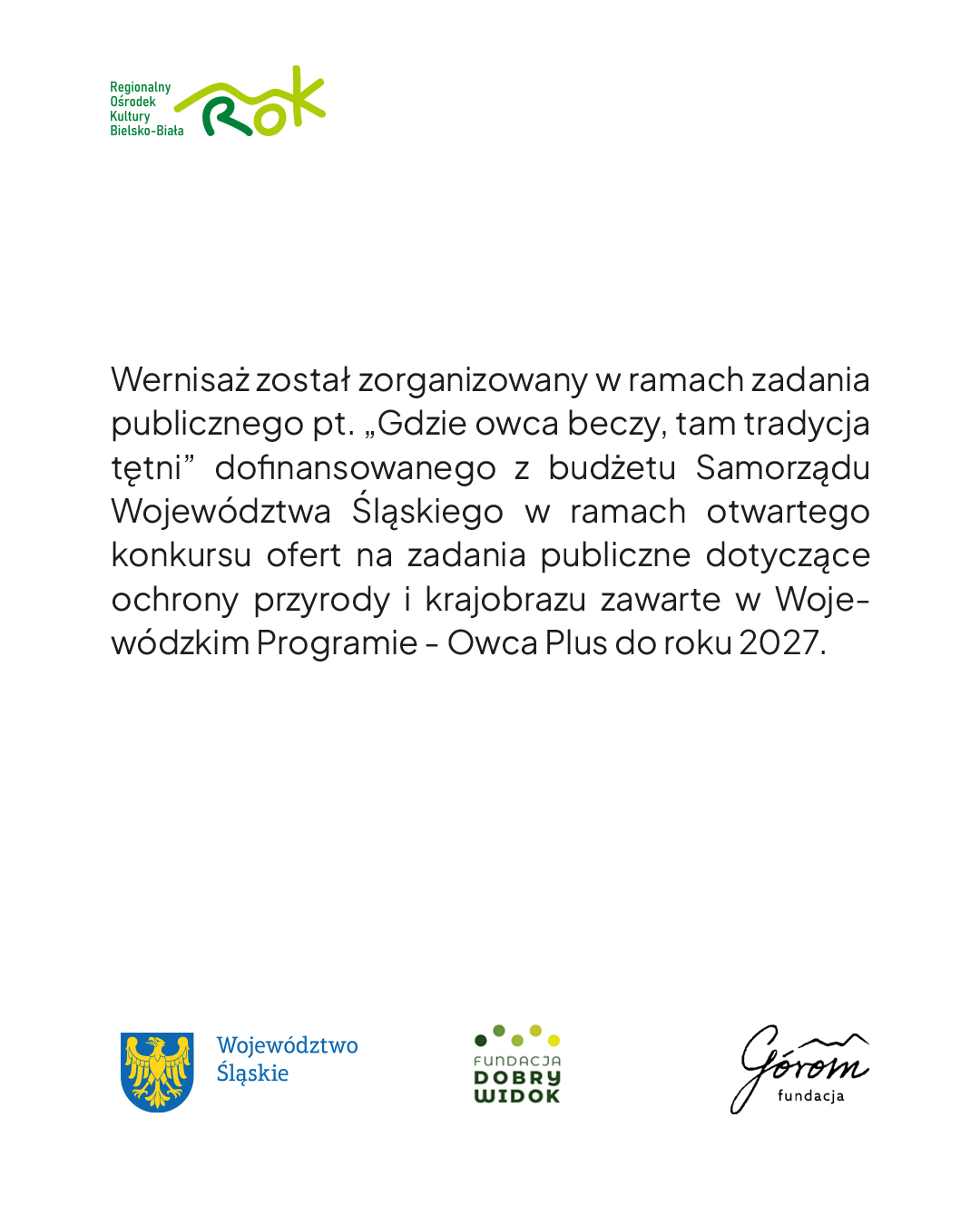 Wernisaż został zorganizowany w ramach zadania publicznego pt. „Gdzie owca beczy, tam tradycja tętni” dofinansowanego z budżetu Samorządu Województwa Śląskiego w ramach otwartego konkursu ofert na zadania publiczne dotyczące ochrony przyrody i krajobrazu zawarte w Wojewódzkim Programie – Owca Plus do roku 2027.