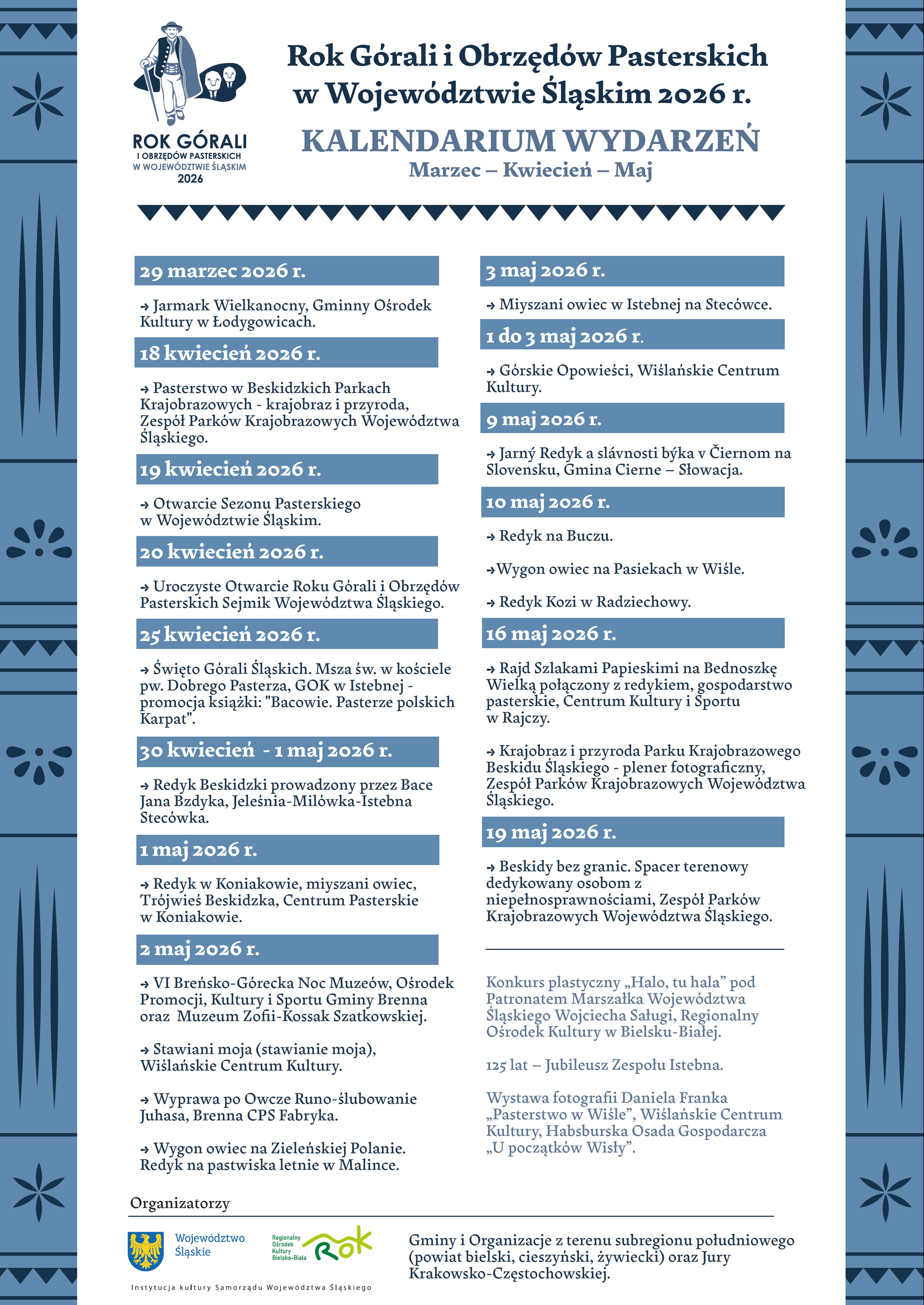 • 20 kwietnia 2026 r.  → Uroczyste Otwarcie Roku Górali i Obrzędów Pasterskich Sejmik Województwa Śląskiego.